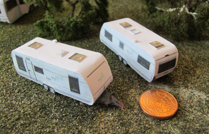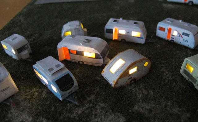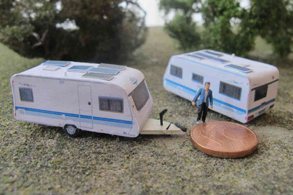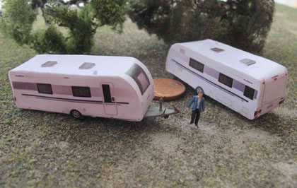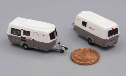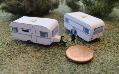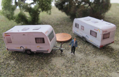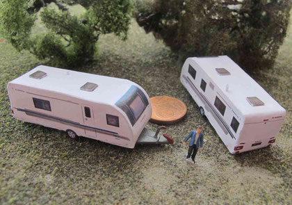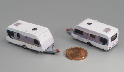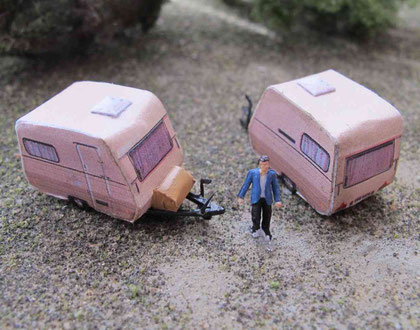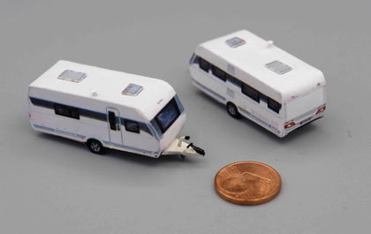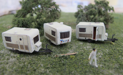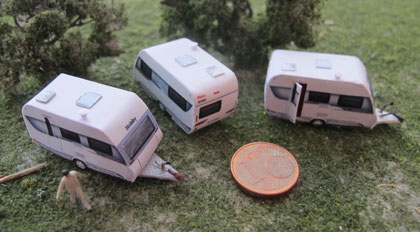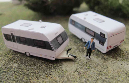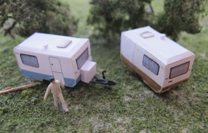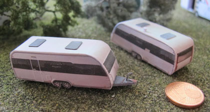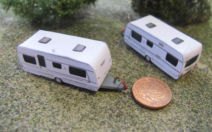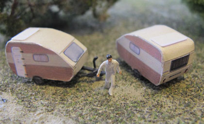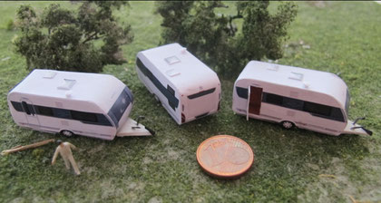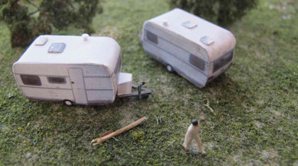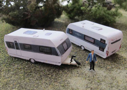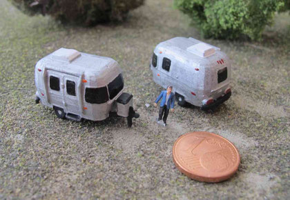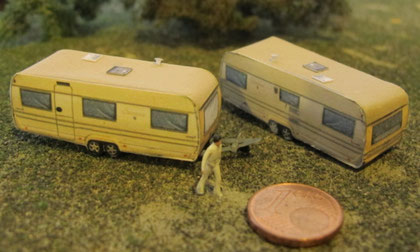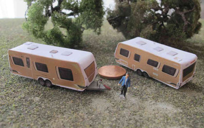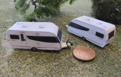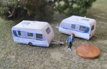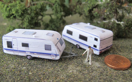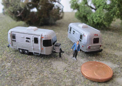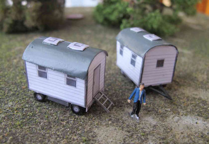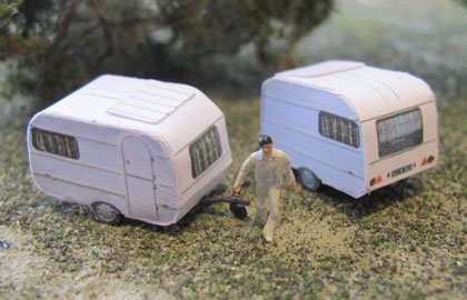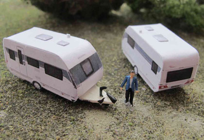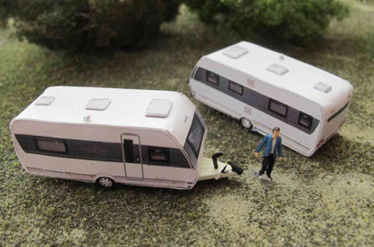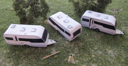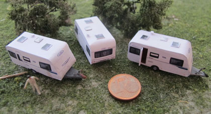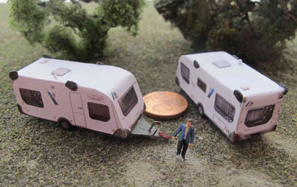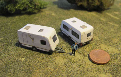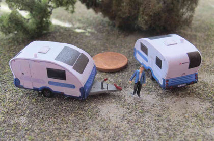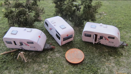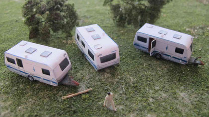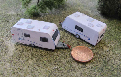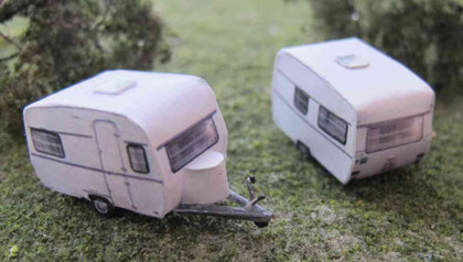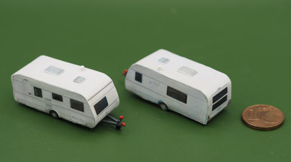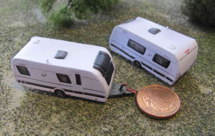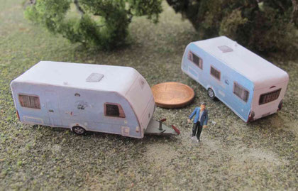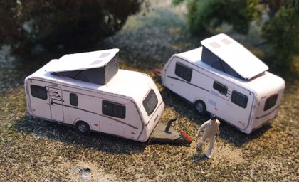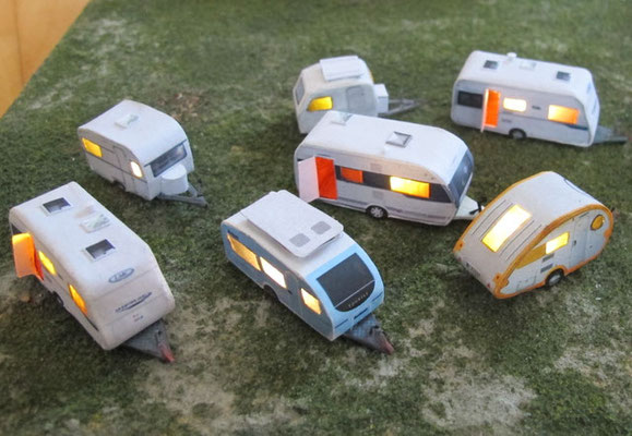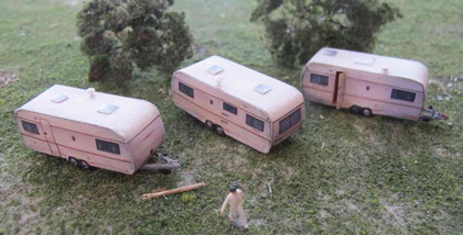 Einige Wohnwagen sind 3D gedruckte Resinmodelle, handlackiert und mit Decals versehen.