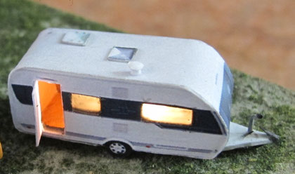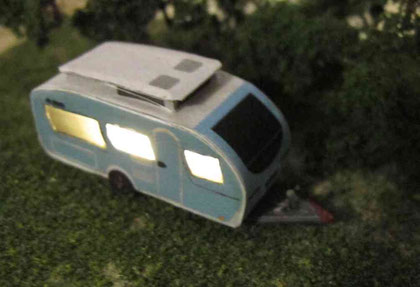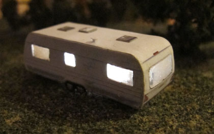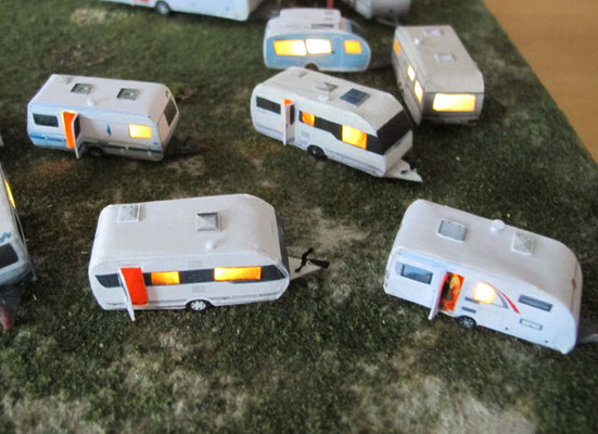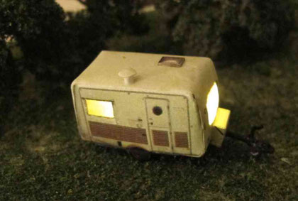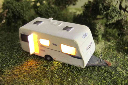 Die Wohnwagen gibt es teilweise auch schon als beleuchtete Version. Wagen mit offenen Türen werden nur an der Vorderseite beleuchtet. Bei geschlossener Türe werden die Fenster je nach Modell unterschiedlich beleuchtet, teilweise auch die Bug- oder Heckfenster. Die Modelle werden innen sehr sorgfältig abgedichtet, damit kein unerwünschtes Licht nach außen dringt. Die Wagen sind mit LEDs und einem Widerstand (am Pluspol) und einer Schutzdiode (am Minuspol) ausgestattet und dh. für max. 16V Gleichstrom oder Wechseltrom ausgerichtet. Es werden mindestens 3 V für den Betrieb benötigt.
