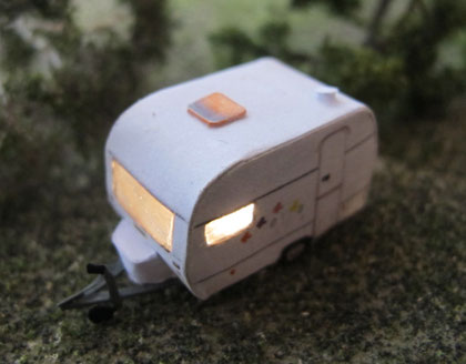 Beleuchtetes Modell: Dethleffs Tourist. 3 Fenster der Vorderseite, 1 Fenster der Hinterseite beleuchtet.